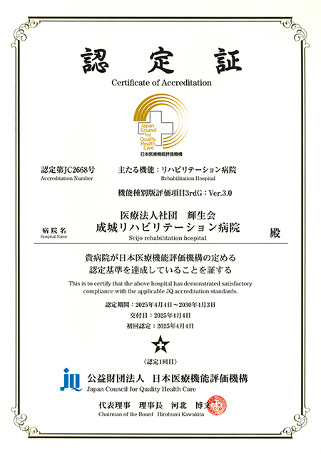 成城リハビリテーション病院は、医療サービスの質を向上させる目的で、公益財団法人日本医療機能評価機構が実施する病院機能評価「機能種別版評価項目3rdG:Ver.3.0」リハビリテーション病院の認定を受けました。